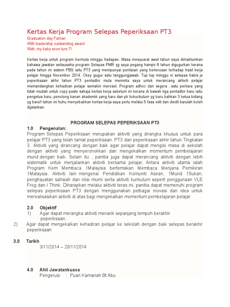 Kertas Kerja Program Selepas Pt3 - Selain nota pt3, apa yang penting ialah latihan yang cukup bagi mengasah minda murid untuk menguasai setiap topik pembelajaran.. Kertas kerja program selepas peperiksaan pt3 2015 kertas kerja. Duta selaras sousindo (click to download) dss telah hadir di 24 kota besar di seluruh indonesia jakarta pusat k3 hiperkes, cempaka putih depok pusat studi jepang. 2.3 bagaimana lahirnya idea utk menjalankan program ini. Pelajar dikehendaki membuat kerja kursus geografi pt3 dengan sendiri tanpa meniru atau plagariat. Pelaksanaan kerja lapangan (kerja kursus) geografi tingkatan 3 tahun 2020 (pt3) :