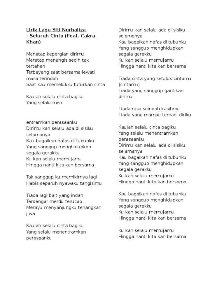 verse am g f c menatap kepergian dirimu f dm b e menatap menangis sedih tak tertahan am dm g terbayang saat bersama c f lewati masa terindah dm b e saat kau memelukku tuturkan cinta. E am yang selalu menentramkan perasaanku. Born 11 january 1979) is a malaysian singer, songwriter, actress and businesswoman with more than 300 local and international awards. Seluruh cinta (all of love) is a collaborative single by malaysian artist, siti nurhaliza and indonesian artist, cakra khan, released on 21 october 2014. Dato' sri siti nurhaliza binti tarudin ssap, dimp, jsm, sap, pmp, aap (jawi:
