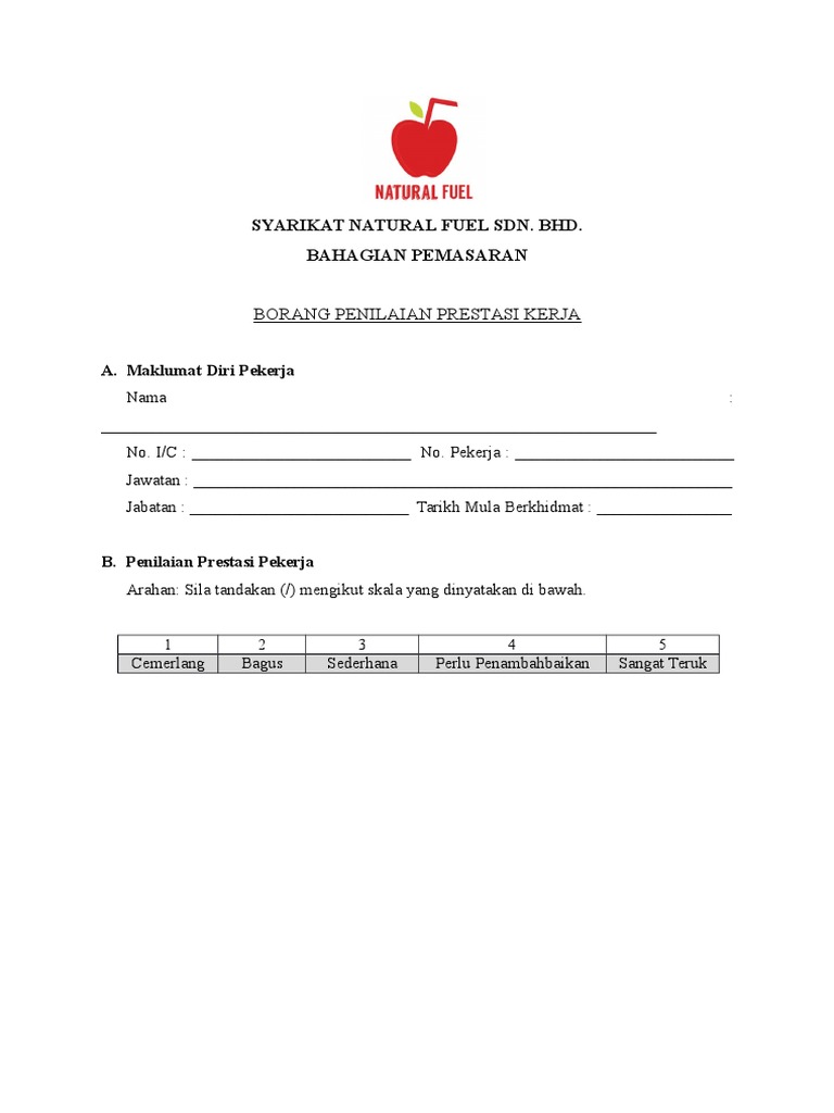 Borang laporan penilaian prestasi tahunan (lnpt) baru di bawah ssb turut disertakan dengan borang sasaran kerja tahunan (skt) atau annual work target. Borang penilaian prestasi docx syarikat lnaa co borang penilaian prestasi pekerja a maklumat diri pekerja nama penilai nama pegawai yang dinilai no course hero for more information and source, see on this link : Borang permohonan cuti tanpa gaji jpa; Borang penilaian pekerja menyelaraskan proses pengurusan prestasi anda dengan memberi anda garis permulaan untuk bermula. Penilaian prestasi hendaklah dinilai berasaskan pencapaian hasil kerja sebenar pyd berbanding dengan sasaran kerja tahunan (skt) melalui penilaian yang ditetapkan dalam borang laporan penilaian prestasi. To find out more complete and clear information or images, you can visit. Penilaian hasil 3.1 melakukan kerja secara. Pelepasan untuk dilantik ke jawatan lain melengkapkan borang laporan penilaian prestasi tahunan jika tempoh perkhidmatan dalam tahun penilaian tidak kurang 6 bulan; Ujian rintis kajian telah dijalankan ke atas 30 responden bagi mengkaji kebolehpercayaan borang kaji selidik sebe1um. Adakah pekerja mengikut arahan dan menjalankan kerja mengikut peraturan keselamatan yang ditetapkan? Borang laporan nilaian prestasi pegawai kumpulan pengurusan dan profesional. Pengemukaan markah prestasi dan memastikan borang diedarkan kepada semua pegawai yang dinilai (bagi mereka yang tidak Mempunyai hubungan kerja secara langsung atau yang mengawasi kerjanya.